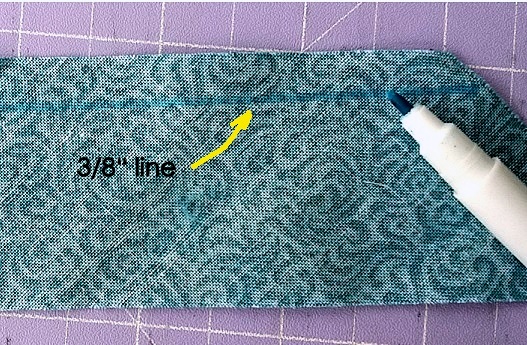 the wrong side of fabric strip, at the same time, draw a ¼” line as the seam allowance.